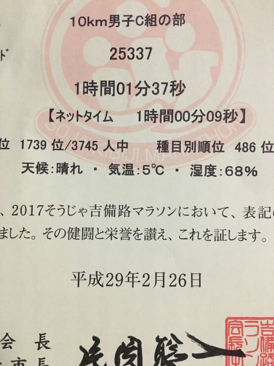 昨日おこなわれました『2017そうじゃ吉備路マラソン』の10キロコースに出場してきました。