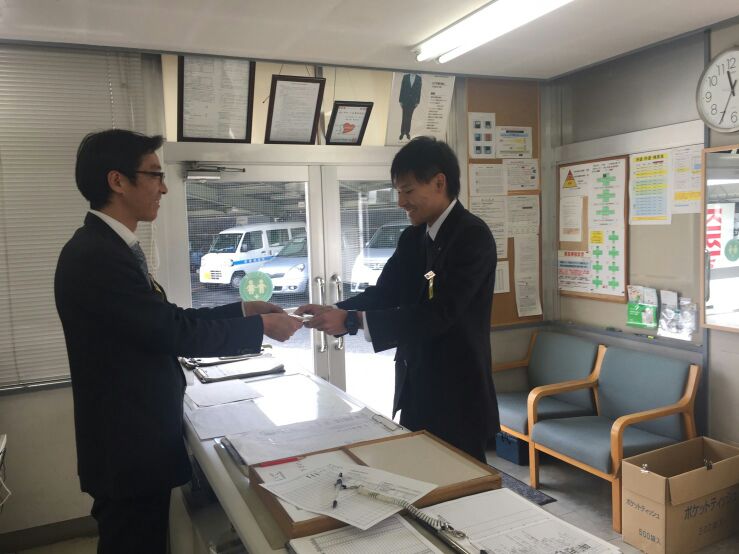 そして、無事故100日達成記念として、日頃の安全運転へ対する取組みへの感謝の気持ちを込めて、乗務社員の皆さんへ所長より、『ご安全に‼️ボールペンと心得カード』をプレゼントしました。