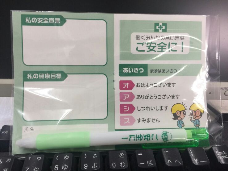 心得カードには所長のメッセージを記入して、個人個人の「私の安全宣言と私の健康目標」を記入してもらい、毎日携帯し、意識してもらえればと思い渡しました。