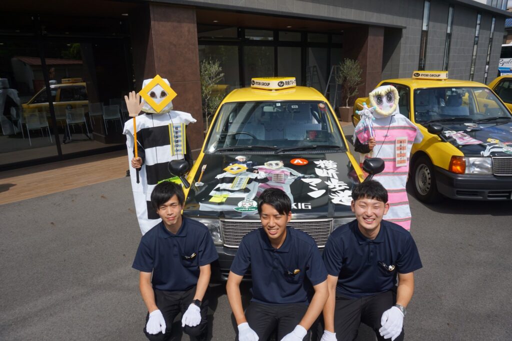 ラッピングタクシーには横断歩道マンと横断歩道レディが乗車し、「ご安全に!」の掛け声とともに発車いたしました。