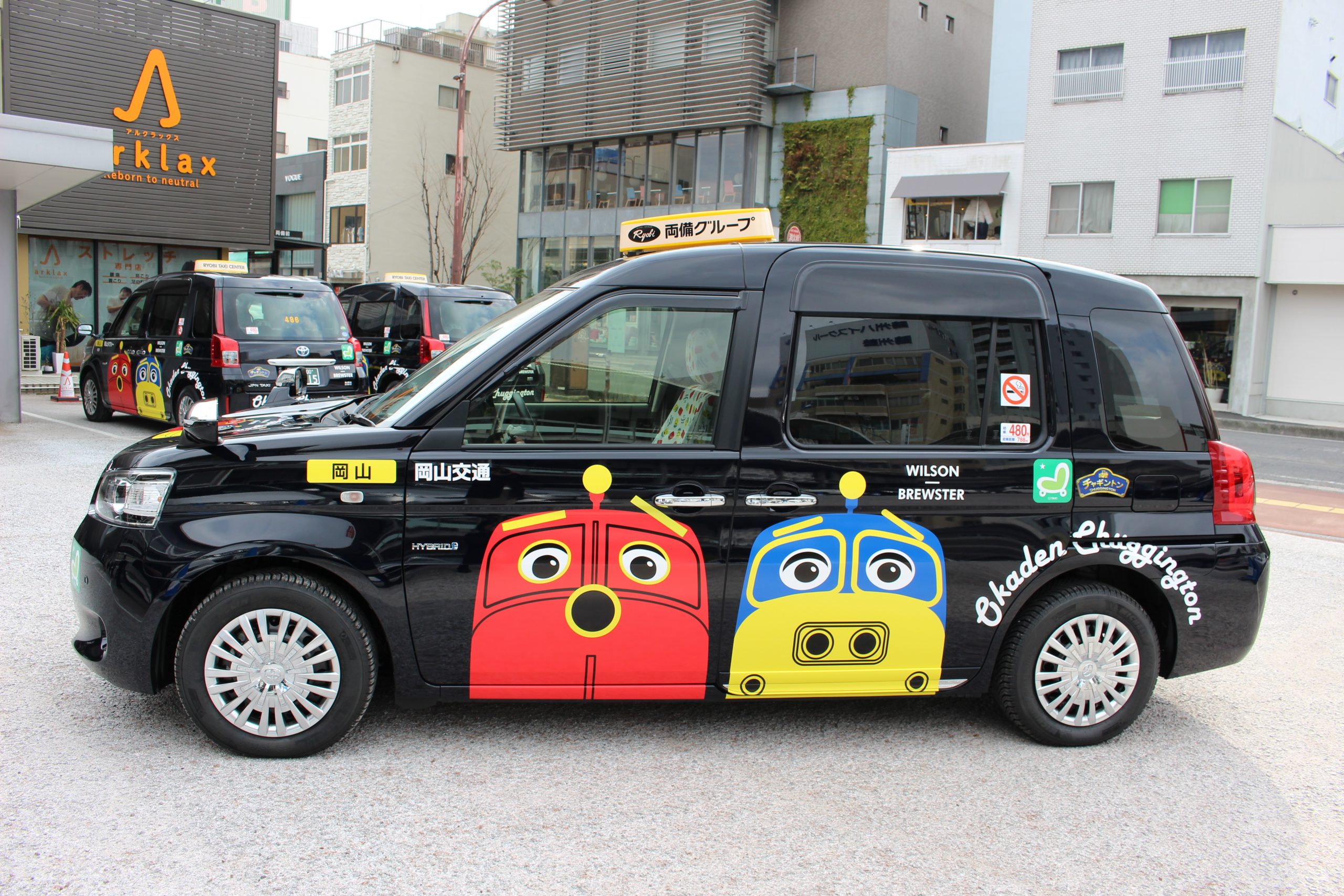 今年、創立110周年を迎えた両備グループは、全社を挙げて「歩いて楽しいまちづくり」を進めており、岡山の「まち」を駆け巡るタクシーだからこそできる応援はないかと考え、チャギントンラッピングを施したタクシー車両を導入いたしました。チャギントンタクシーは岡山市内で3台だけのレアなタクシーです。