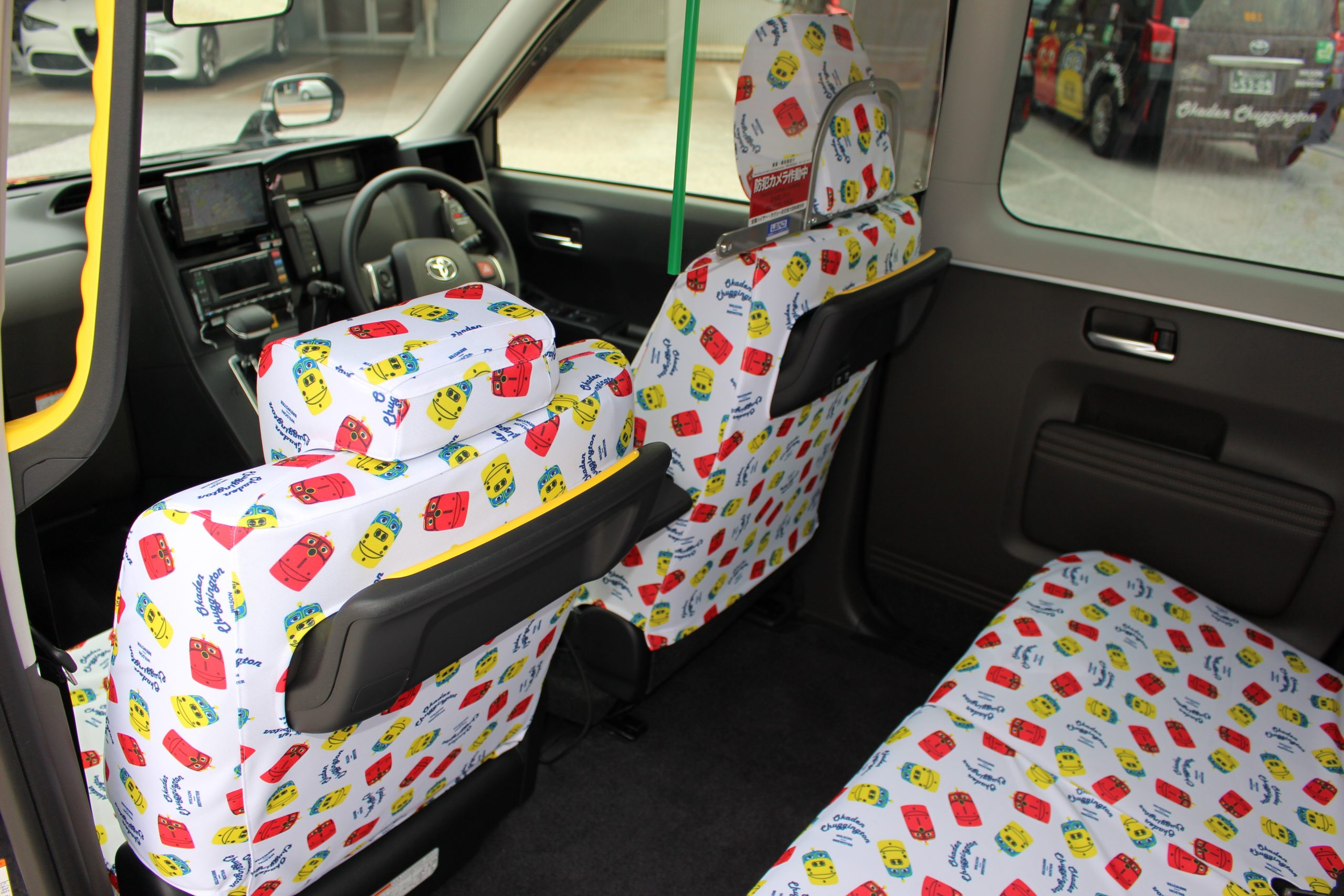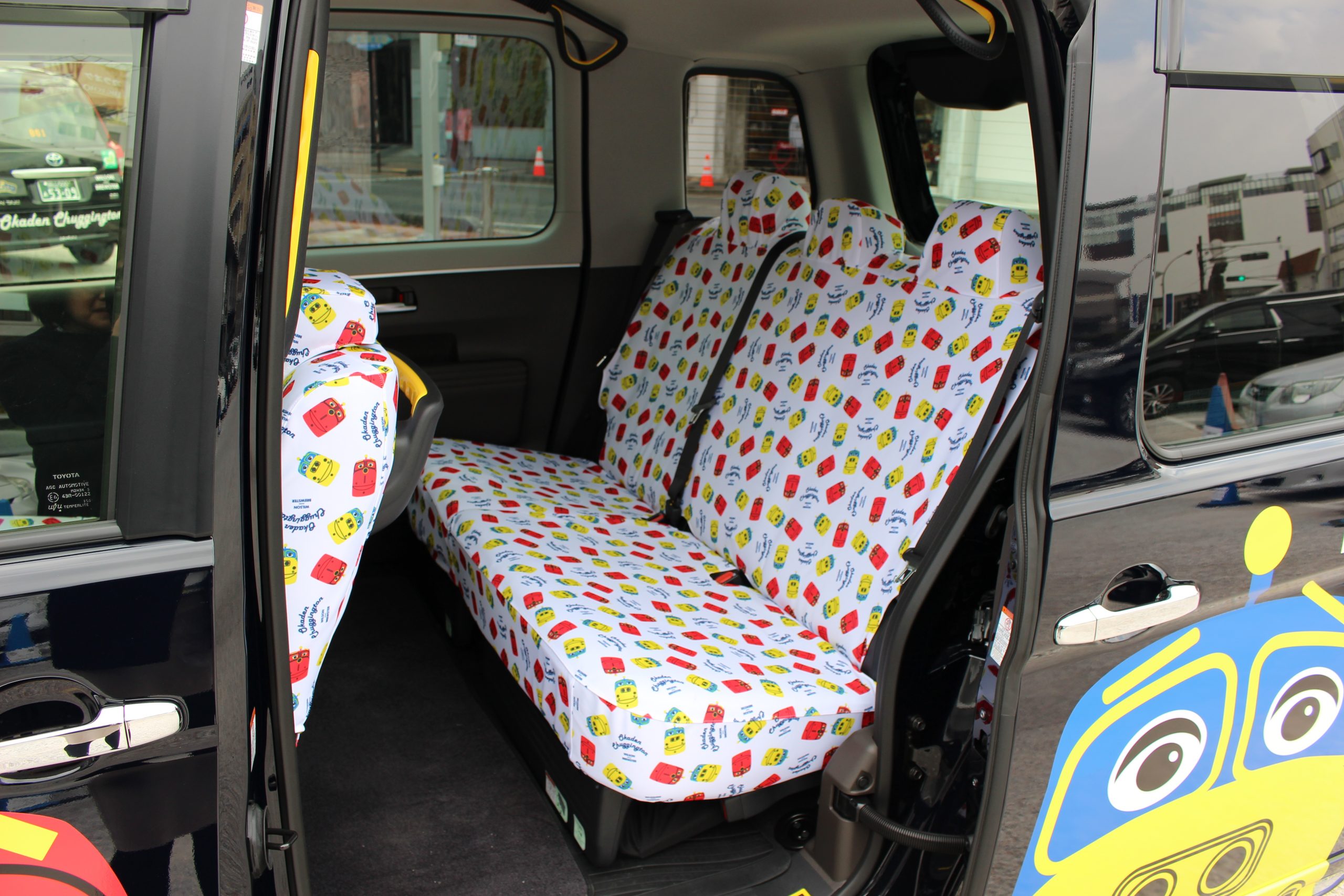 左右のドアとボンネットには、チャギントンのキャラクター「ウィルソン」と「ブルースター」が大きく描かれ、車内のシートカバーにもたくさんのキャラクターがあしらわれています。