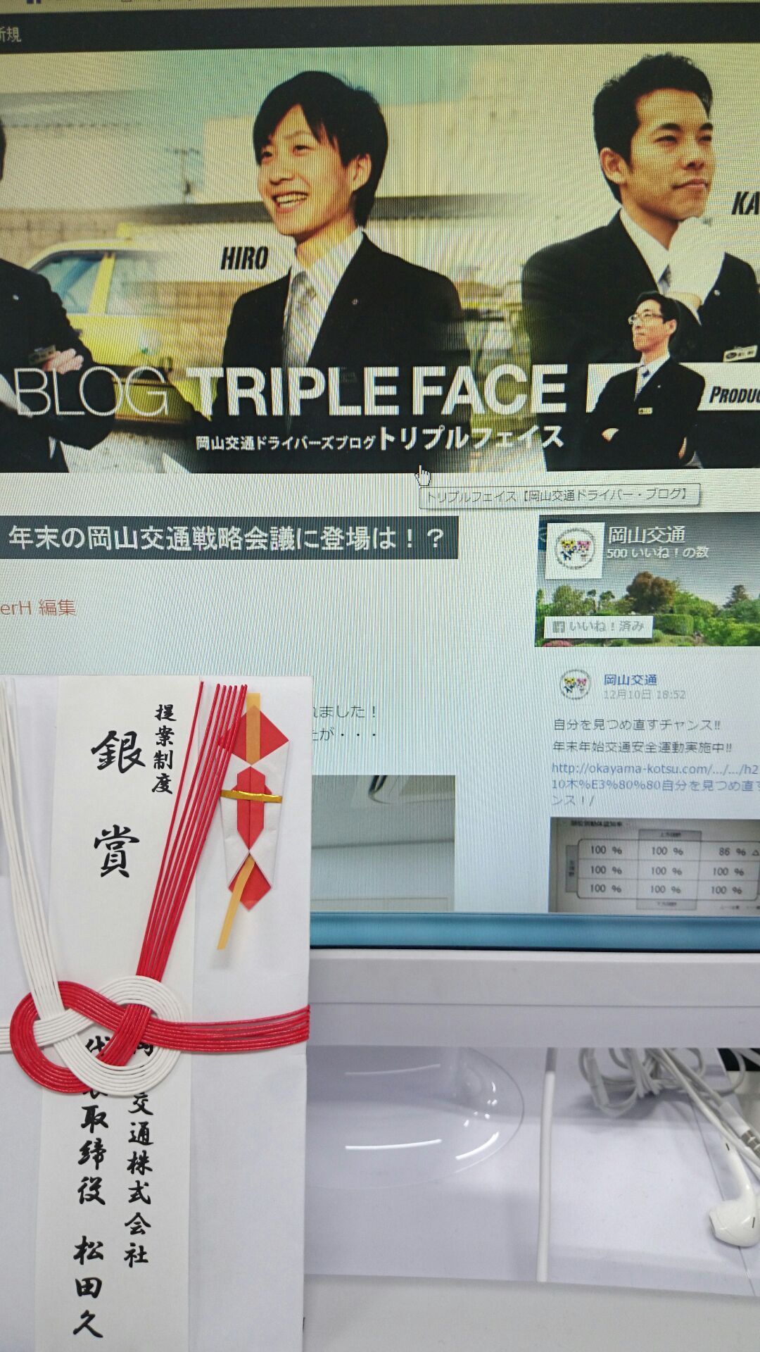 ProducerH 2015.12.21 H27.12.21(月) 年末の岡山交通戦略会議に登場は!? 本日は、今年最後の岡山交通戦略会議の日。 会議に先立ちまして、昨年に引き続き、提案制度の表彰が行われました! 昨年は、トリプルフェイス効果でマネージャーが表彰されましたが・・・ ・・・今年はなんと!!私が!!! アイディア賞をいただきました!!! 感無量です!!・・・そして、待ち構えていたのは・・・忘年会会費・・・・。美味しい食事へと変わるのでした・・・・。 ・・・あれ??マネージャー??! なんだかマネジャーの方が良さそうな・・・??? ・・・感無量です!!Producerを刺激しないように写真は小さくしておきましょう・・。(byマネージャー) 一覧へ戻る