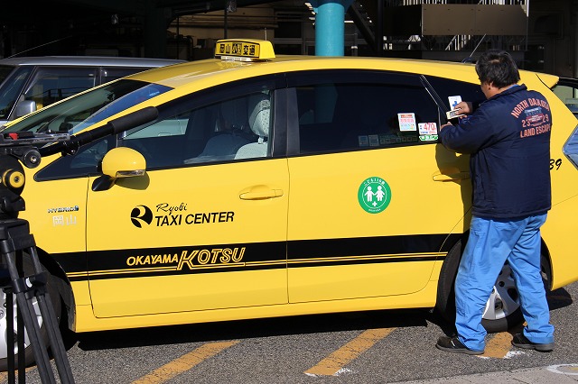本日、11月28日から岡山県内ほとんどのタクシー会社が運賃を改定することになり、我が両備タクシーグループもその準備です。その準備の中に料金メーターの設定変更や運賃表示シールの張り替えがあるのですが、その張り替えを撮影されるとのこと。そうですね、普段はなかなか見られないシーンです。そのシーンの取材はこんな感じでした。