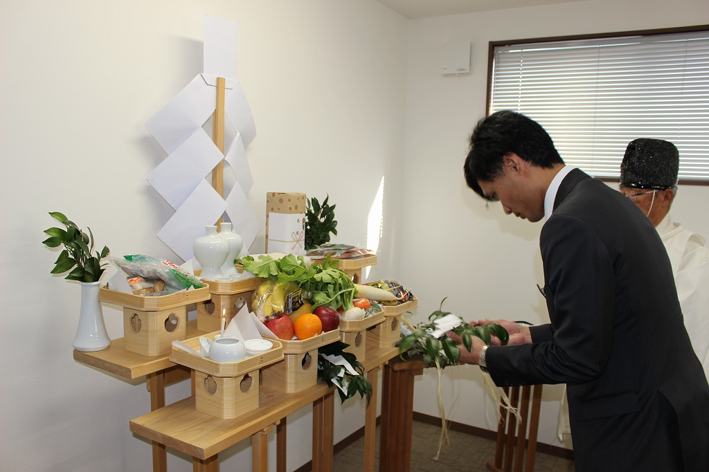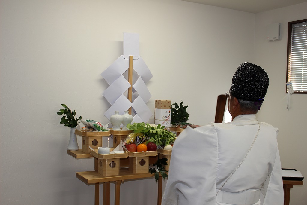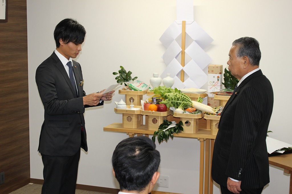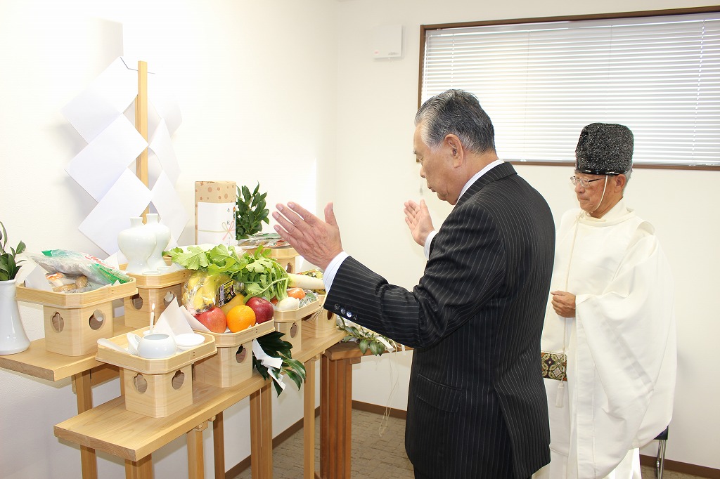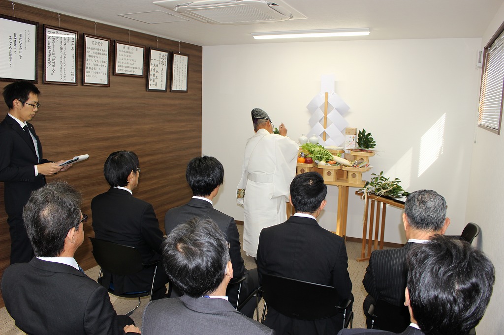 当日は、営業所の繁栄と安全を祈願するため、宮司様にお越しいただき神事を執り行い、土江代表、塩谷労働組合委員長、西大寺営業所・荒木所長をはじめ12名が参列いたしました。