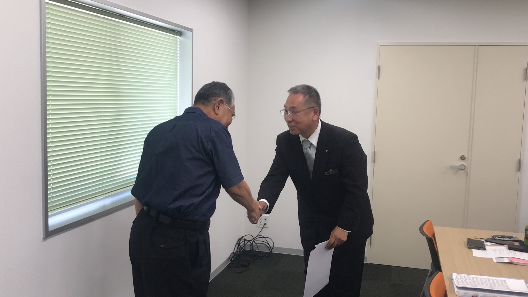 8月5日の会議にて、土江代表よりリーダーの江原乗務社員へ表彰状と賞金が贈られました。