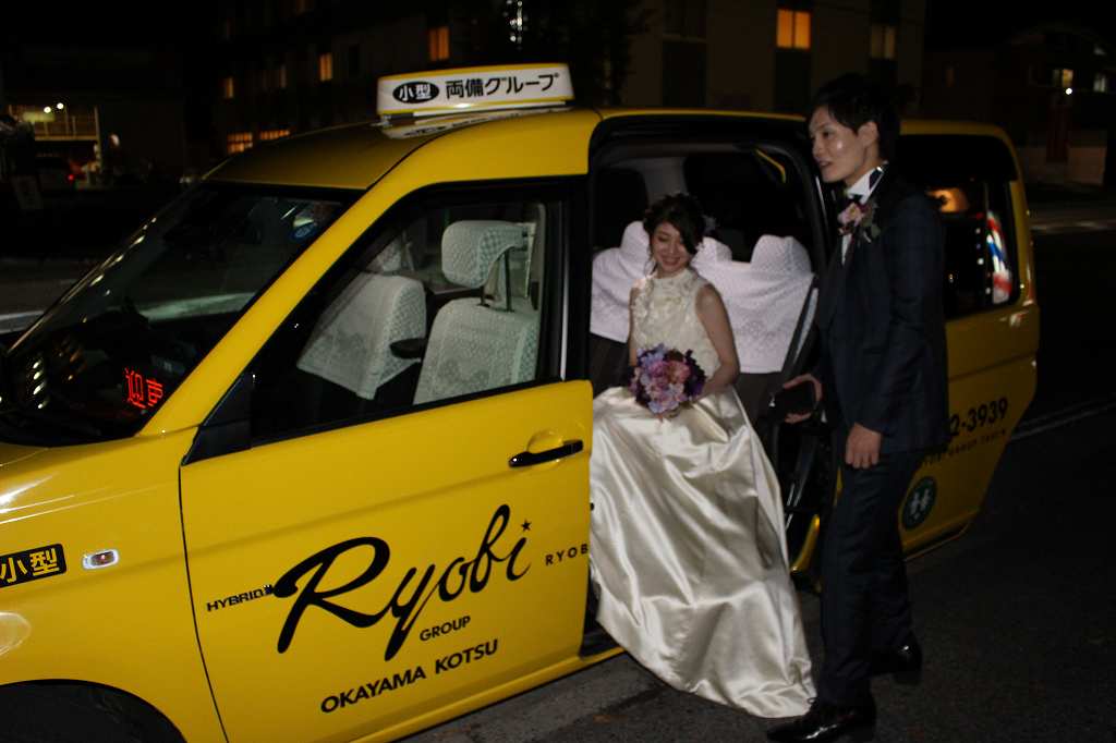 今回は、披露宴会場から二次会会場までの送迎であったため、暗い中でのお迎えとなりましたが、乗り降りもスムーズにご乗車いただけました。
