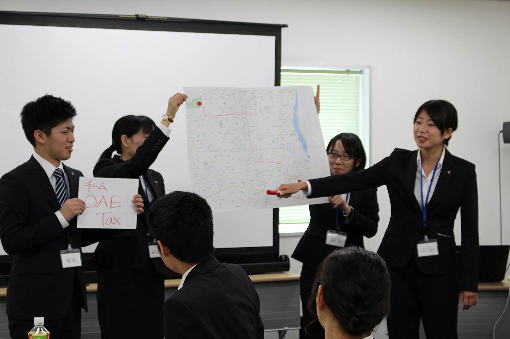 発表を終えたら、実際にタクシーに乗って、自分たちの決めたルートを走ってみます。もちろんメーターは倒しますが、結果発表までみんなには見えないように隠して走ります。