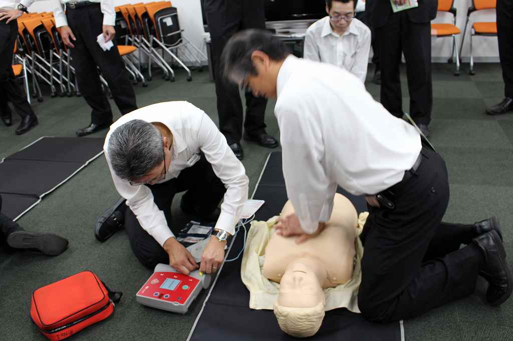 実は両備グループでは以前からこの講習を定期的に行っていて、映像による応急手当の概要説明のあと、心肺蘇生、止血方法、AEDの取り扱いをチームに分かれて実習を行います。