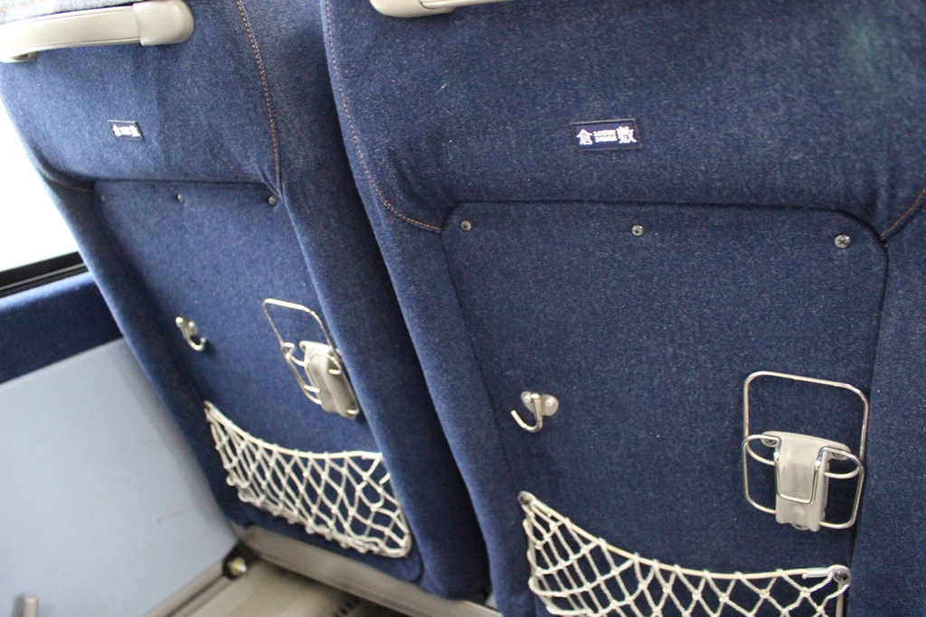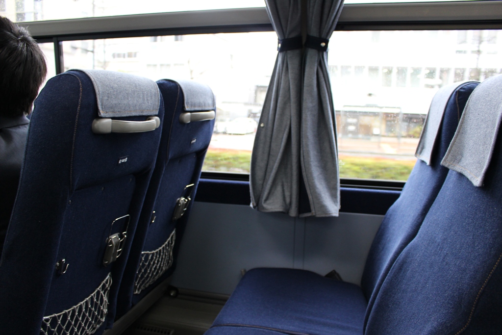 バスについている補助席もデニムカバー。よく見ると、運転席も、ガイド席もデニム。職人さんの技が光ります!