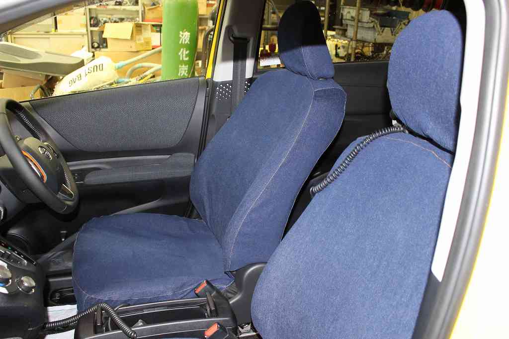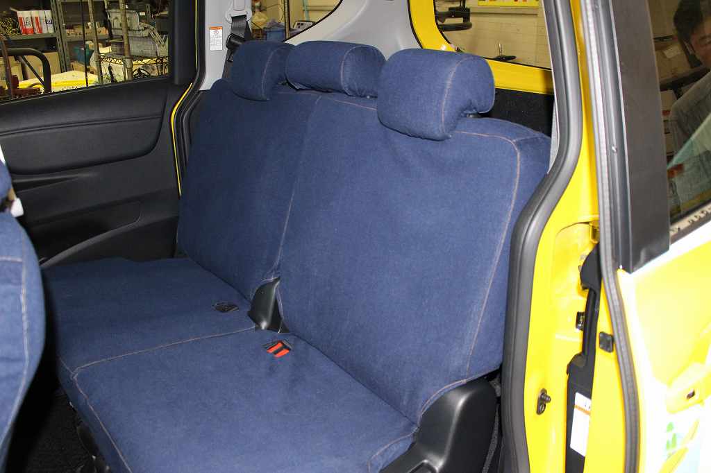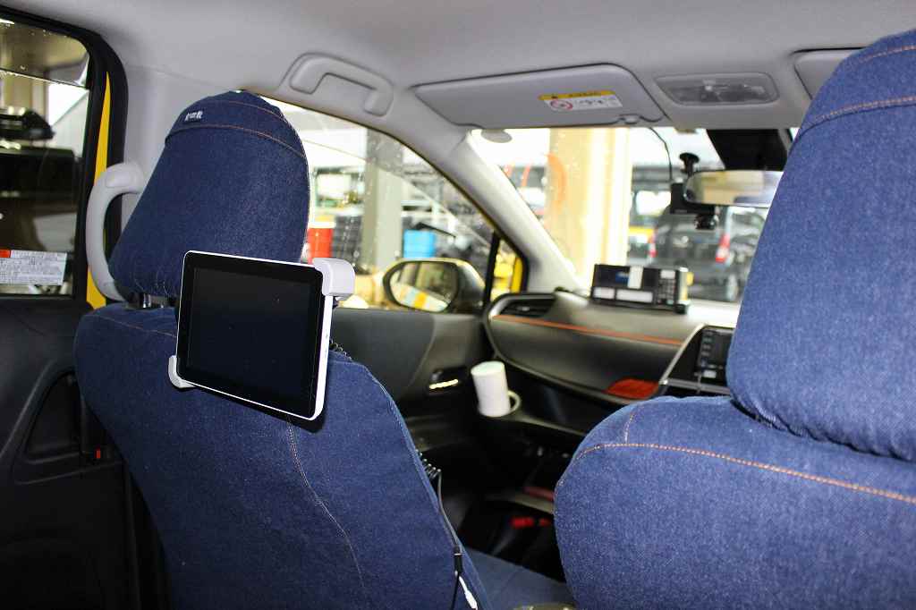 通常のタクシーは白いカバーを装着していますが、ワンセトタクシーは「株式会社ナック」プロデュースによる倉敷デニムの布地を使用したシートカバーを採用し、デニムの優しい感触をお楽しみいただけます。