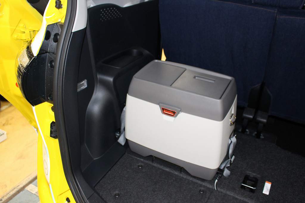 トランクには冷温機も設置しました。これは夏には冷たい飲み物を、冬には温かい飲み物を提供することも可能です。サービス開始時には岡山県産茶葉を使用したお茶「引両紋」を期間限定でプレゼントする予定にしております。