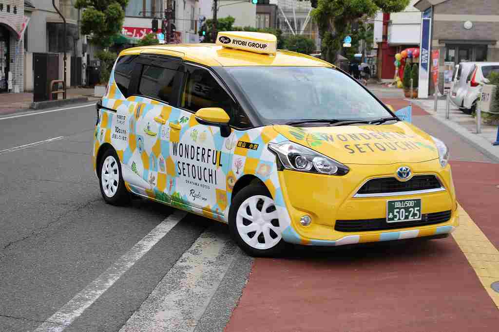 みなさんお馴染みの黄色ののタクシーを基調として、水色、白色でコーディネートされた車両で、明るく爽やかな瀬戸内を表現しています!!