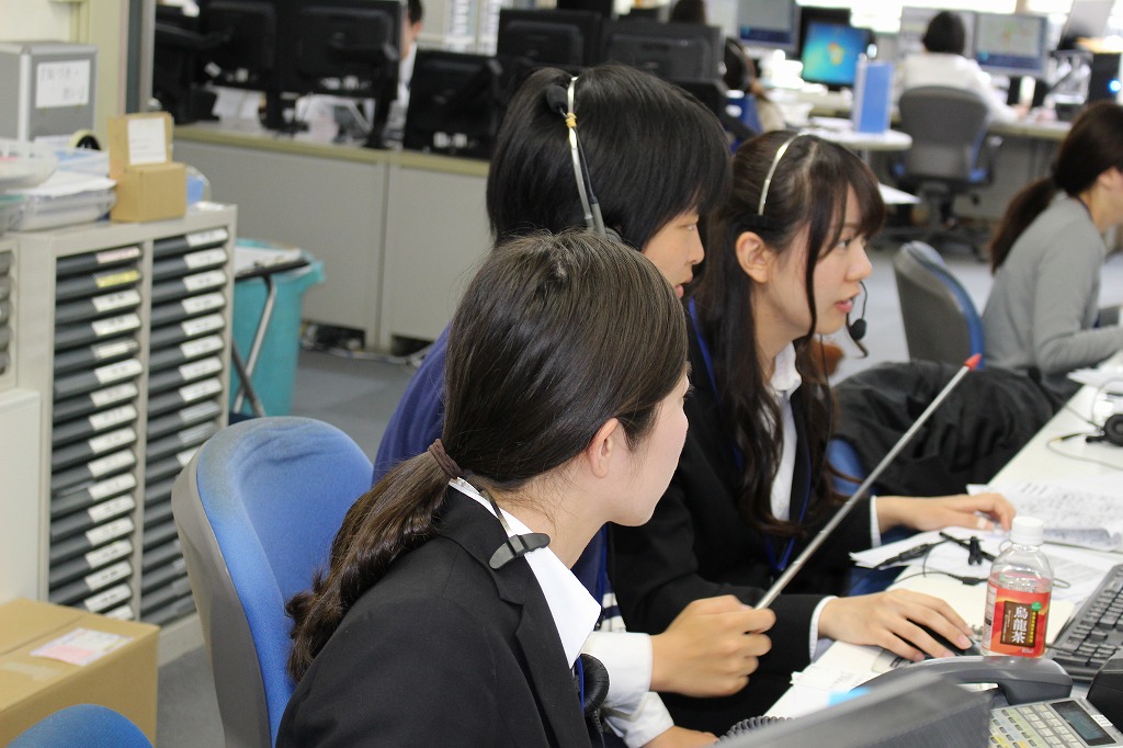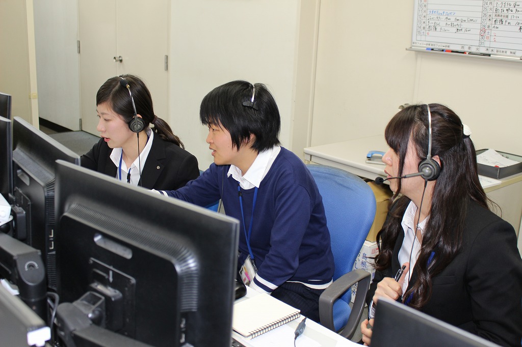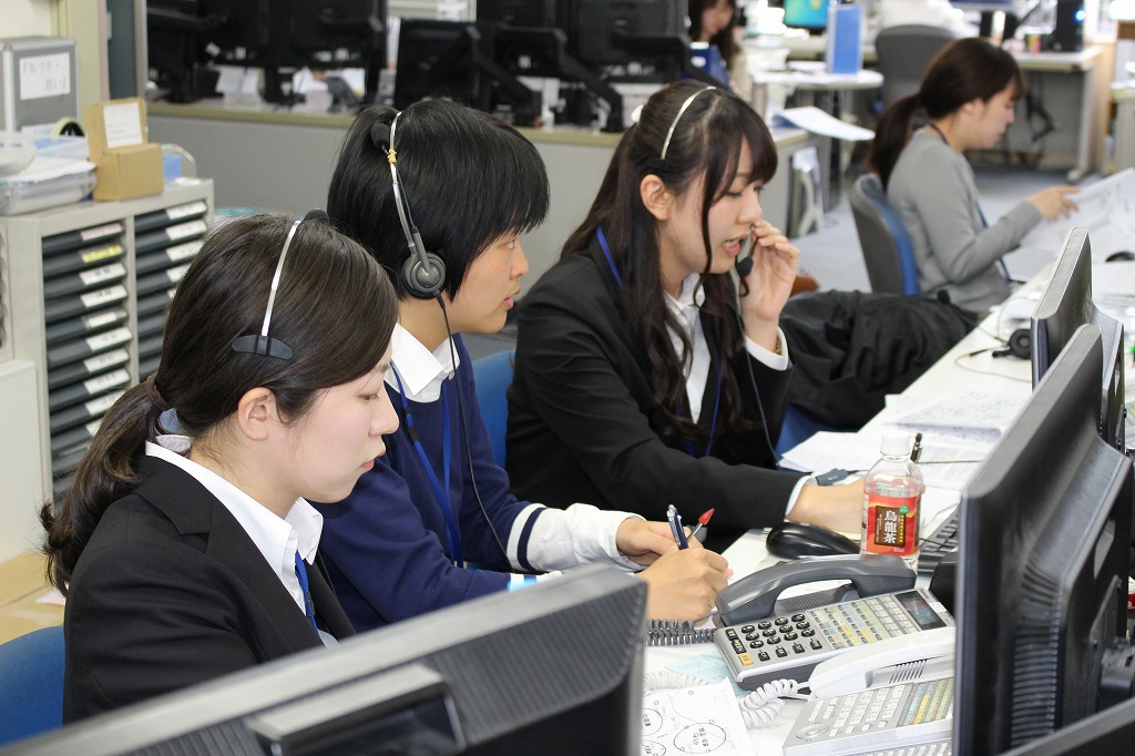 配属後の不安を少しでも取り除こうと、研修期間中に2~3名ずつが電話の前に座り、先輩社員がそばについて、実際に数本の電話を受ける訓練です。