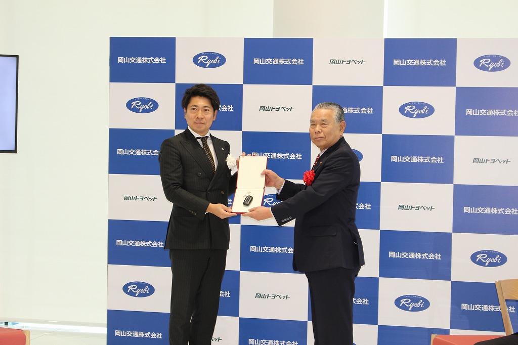 当日は、岡山トヨペット株式会社役員の方々にもご臨席いただき、キーの贈呈、花束を贈呈していただきました。
