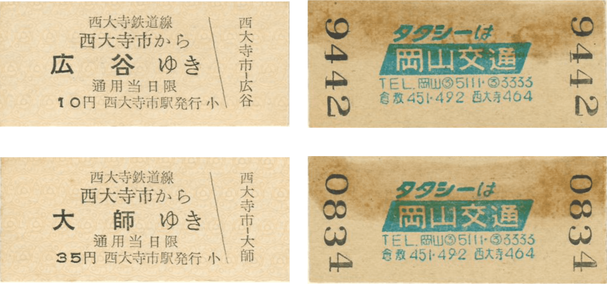 古い乗車券(硬券)の裏面には、岡山交通の広告。