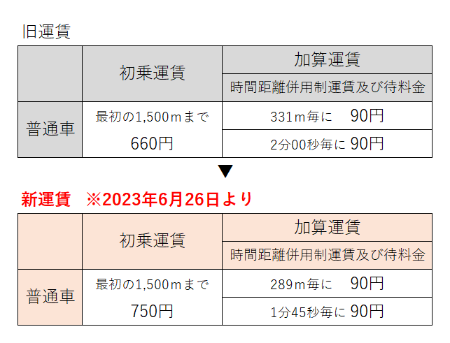 この度、タクシー運賃の改定が公示されましたので2023年6月26日よりタクシー運賃を下表のとおり改定させていただくことになりました。何卒ご理解いただくとともに、今後とも変わらぬご愛顧を賜りますよう、お願い申し上げます。