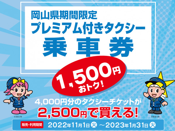 岡山県の発行する「岡山県期間限定プレミアム付きタクシー乗車券」の取り扱いが2022年11月1日(火)より開始となります。