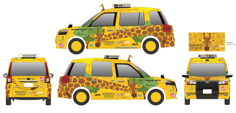 岡山交通の黄色いタクシーと黄色い魅力がコラボするシリーズとして、今回は、池田動物園のアミメキリン「サンタロウ」をモチーフにデザインいたしました。サンタロウのイラストを大きく描いた車体や、サンタロウ柄のシートカバー、車体前方にサンタロウのオブジェを装着した「サンタロウタクシー」が元気に街を走り、サンタロウと池田動物園をアピールするとともに、地域活性に努めて参ります。