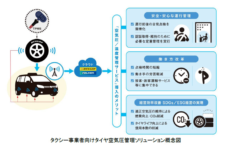 日々長距離を走行するタクシーの安全運行をサポートするサービスとして、有効性、点検時間の短縮、タイヤライフの向上、燃料費削減などの具体的な効果を検証することで、安全性・経済性の向上が期待されます。